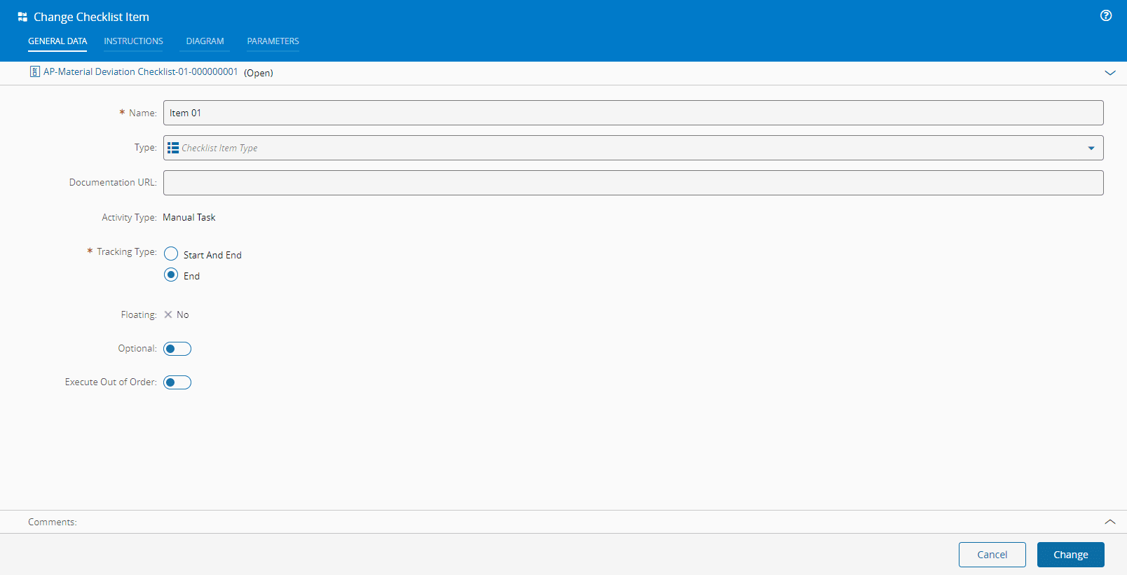 5. If you change (Change Item) the selected Checklist Instance Item, a new Checklist Instance Item is created based on the selected one. This option is similar to Add Item Before/Add Item After operation, except that it starts with a pre-filled Checklist Item: