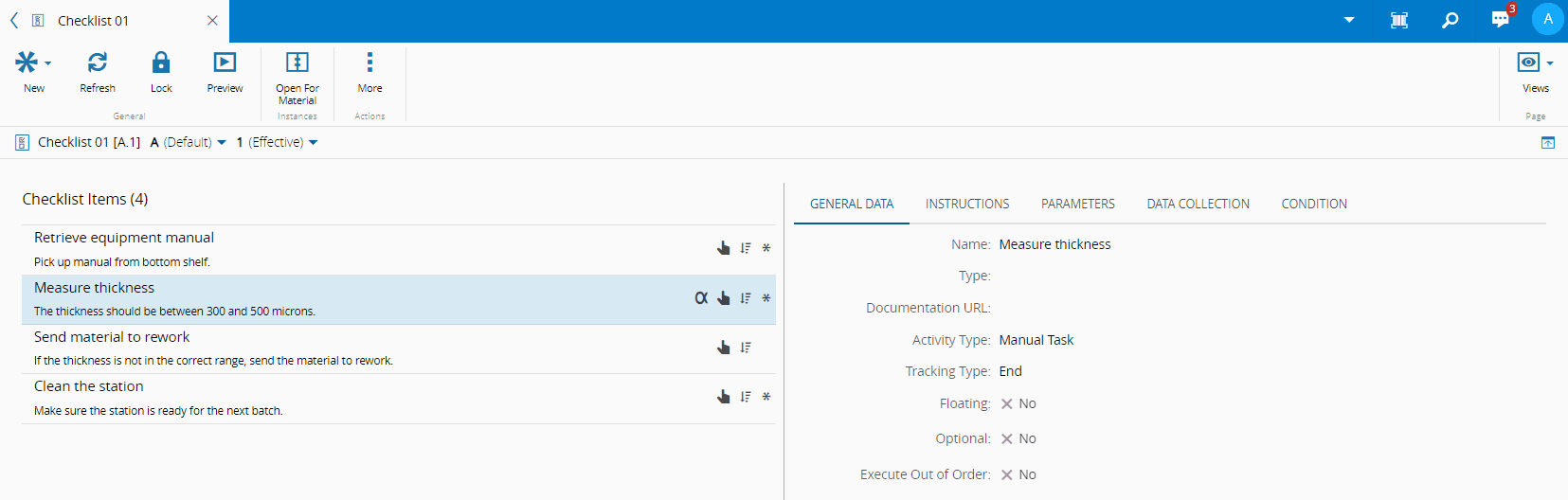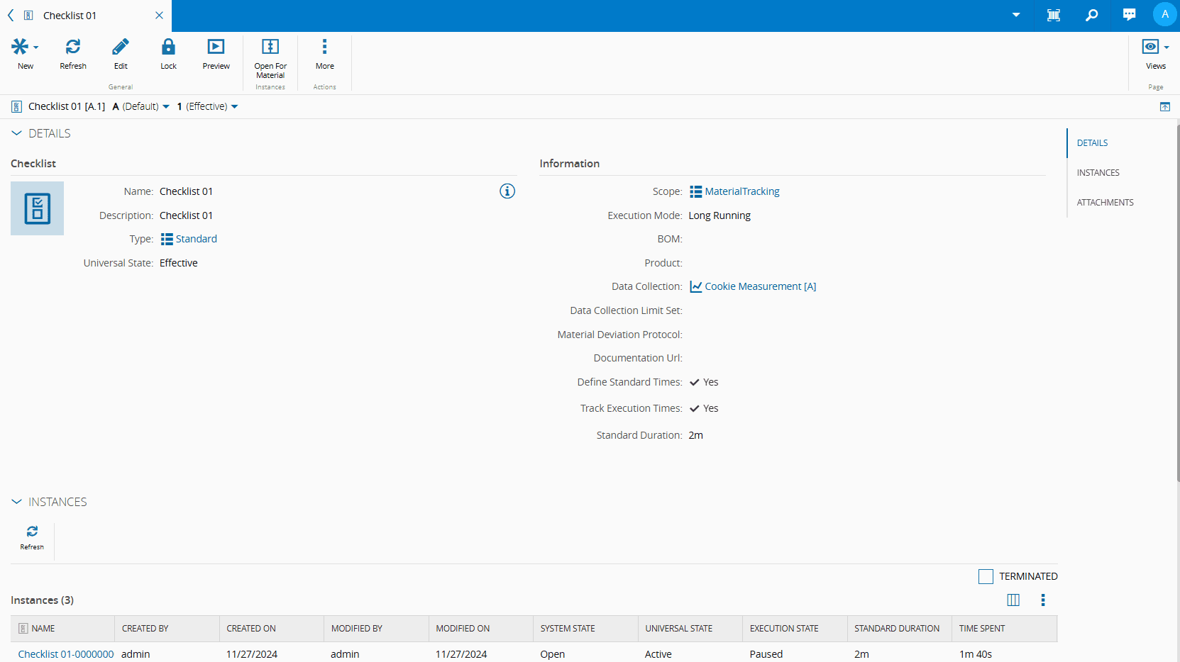 - Instances - displays information on the Checklist instances that are either open or closed.