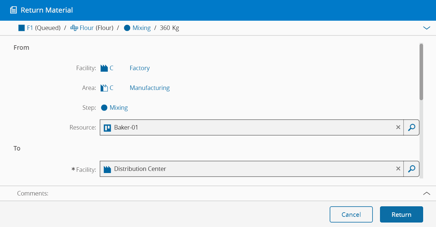 5. Select a return Reason (defined in the lookup table MaterialTransferReturnReason).