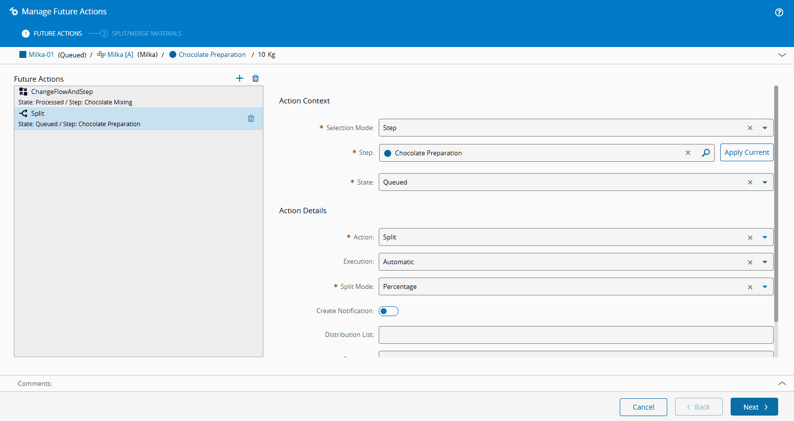 - Future Actions of type Split and Split For Step will need further specifications on the Split Mode, Type of Material and Quantity to be Split. For more information on how to define these criteria, see the Step 2.