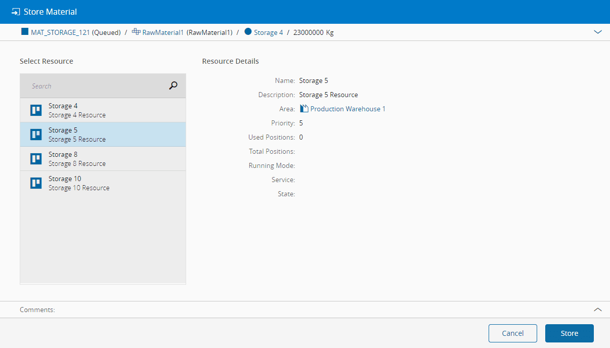 true, provide a valid position. Note that in this case the provided position address must be compliant with the defined Resource position address format. - If the Resource has any Storage Bins configured, a Storage Bin must be specified. A flag can be set to show only the Storage Bins marked with the Preferred Storage Location flag.