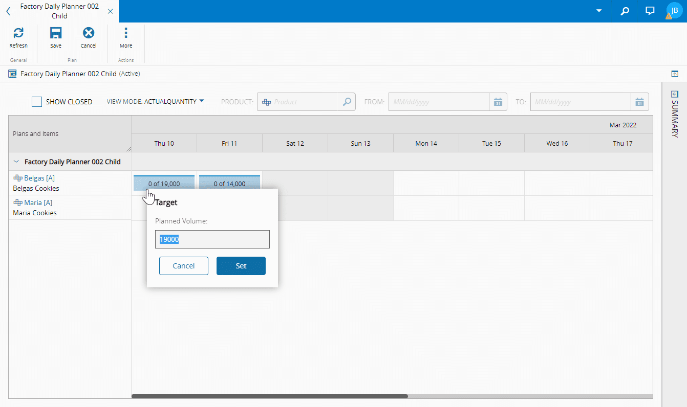 Much like the Edit Plan Scenario, adjusting the targets of a Plan Scenario places the current Plan Scenario in an editing mode, allowing you to perform changes to the planned values defined for each of the time frames available. Selecting any of the grid cells will show a small popup dialog where you can enter the new target value for that time frame.