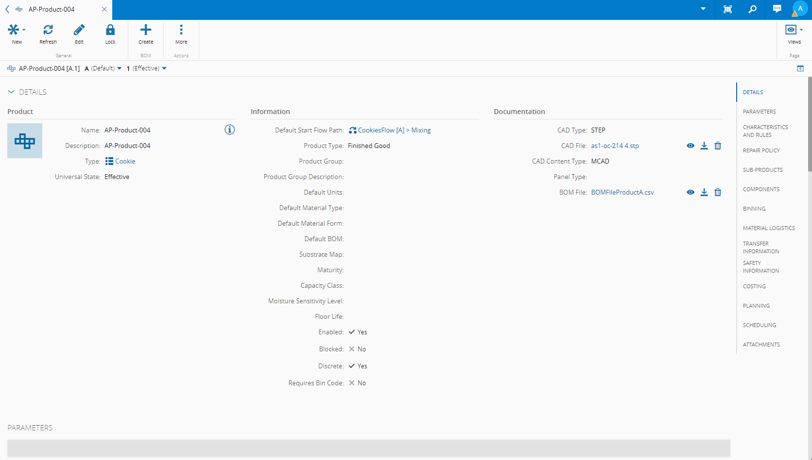 - Parameters - section to define and manage the defined Parameters that are part of the Product. Parameter attributes can also be seen by selecting the arrow on the right-most side of the row.