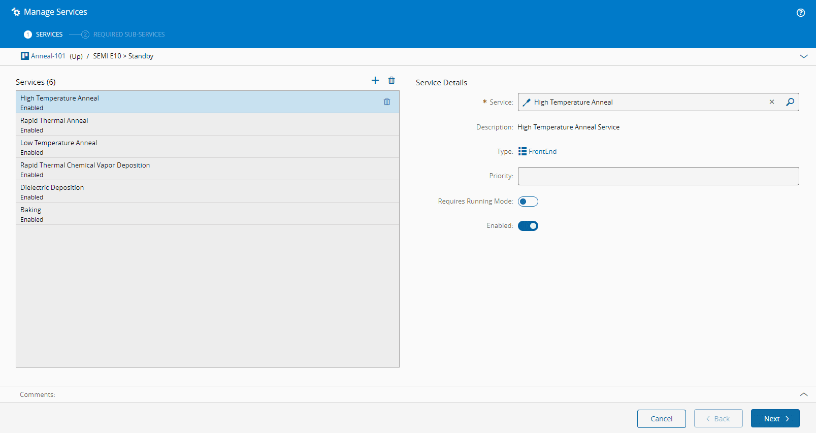 - Optionally, provide a list of the required Sub-Services for that service. You can add or remove services (select to add, and to remove) of which the Processing Type must be Process.
