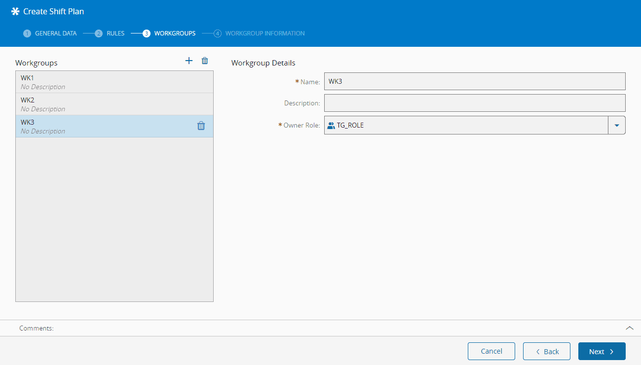 This screen is used to capture Shift Plan Workgroup information. Add, edit and remove Workgroups providing for each Workgroup: