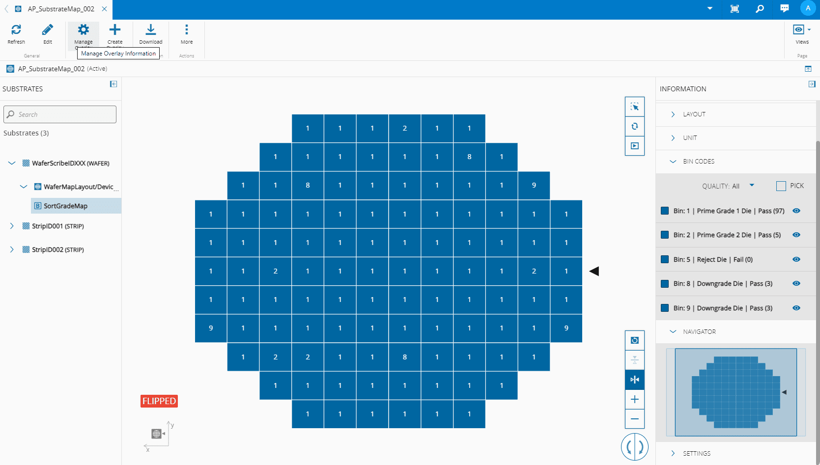 It is also possible to pan, use the select mode, reference device mode, reset view, flip vertically/horizontally, zoom in, zoom out, and rotate the Substrate Map. Additionally, by selecting a cell, a pop-up will provide you with information that is specific to that cell: