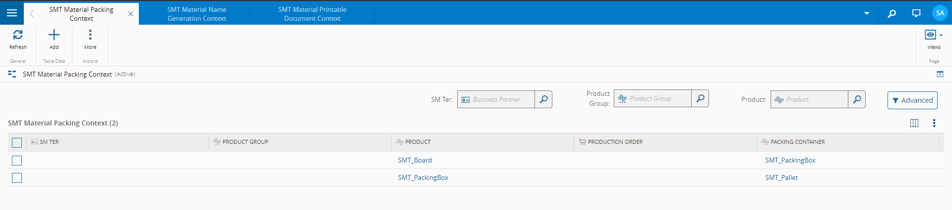 In the example above, there is a packing scenario with 2 levels. In the 1st level Materials with Product SMT_Board can be packed into Materials with Product SMT_PackingBox and in the 2nd level the Materials with Product SMTPackingBox can be packed into Materials with Product SMT_Pallet.