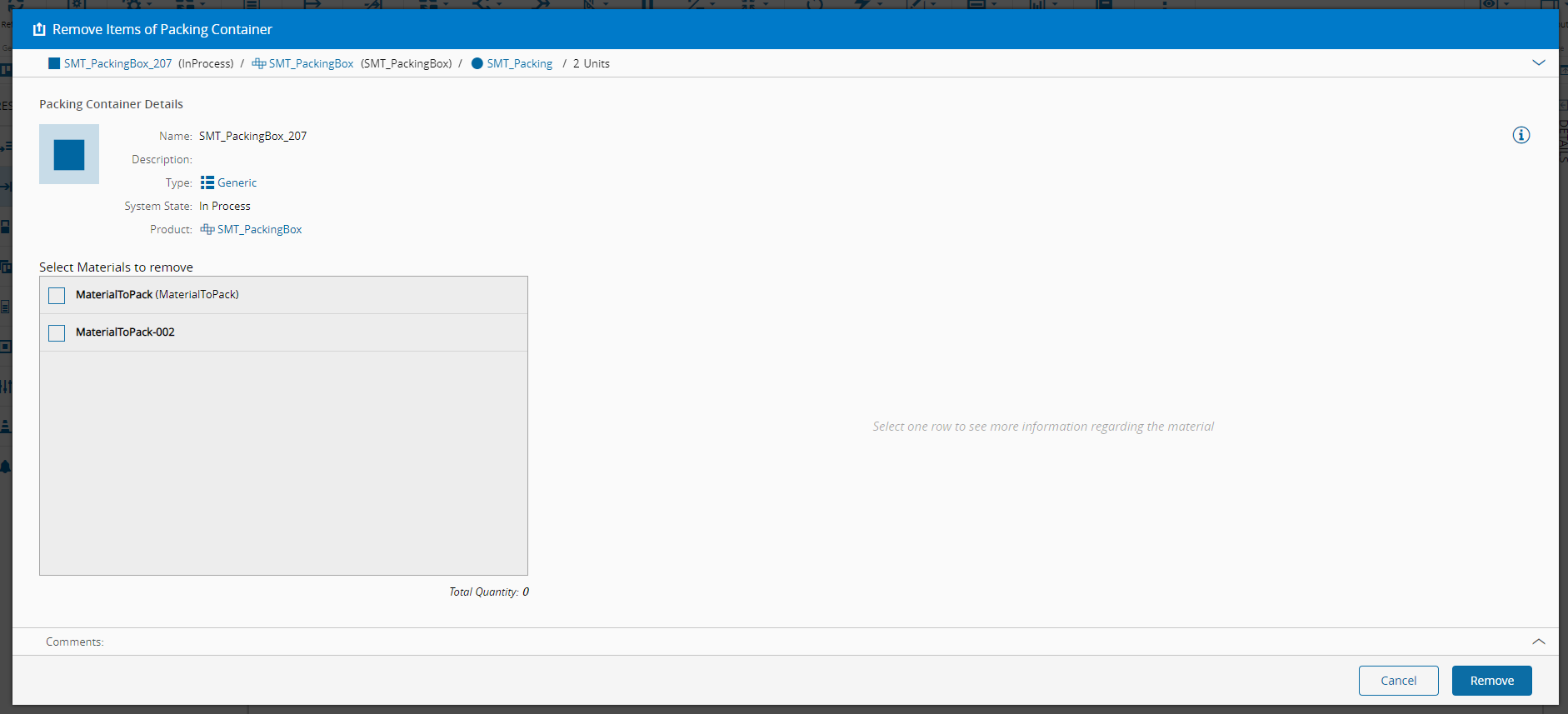 IsPackingset to true). - After the remove item(s) operation, if the Packing Container has no sub materials it will be terminated.