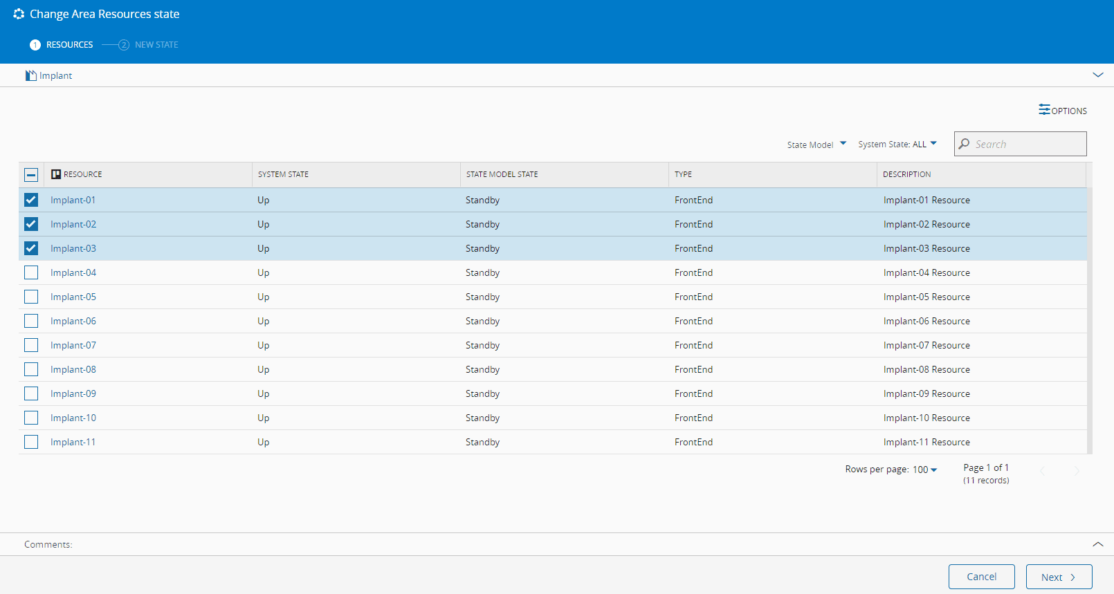 These states are subject to being changed by clicking on the Change Resources button, in the header. When the wizard is displayed, select the Resource(s) whose state you want to modify and select the desired new state on the next page, followed by Finish, as demonstrated below: