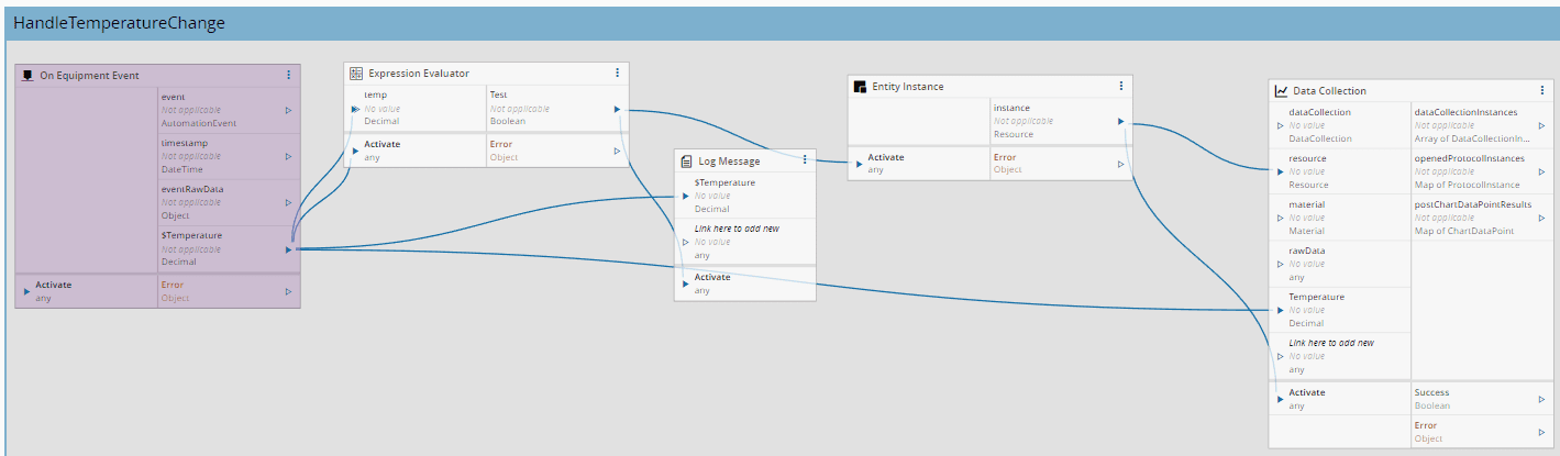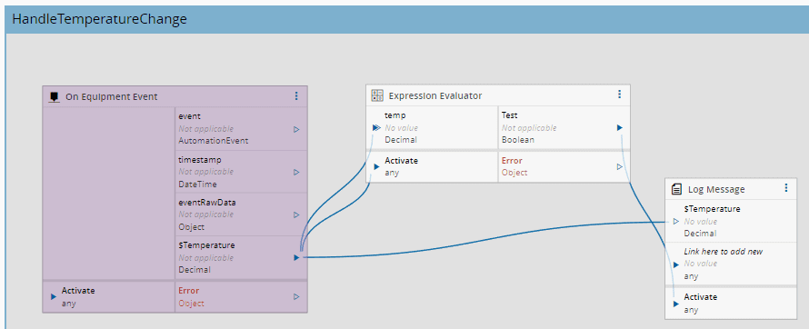 On Equipment Event: to listen to the Event "OnTemperaturChange", and to retrieve Temperature valuesExpression Evaluator: to assess if the Temperature is above 200 degreesLog Message: to print the message into the console, in case the Temperature evaluation result is true