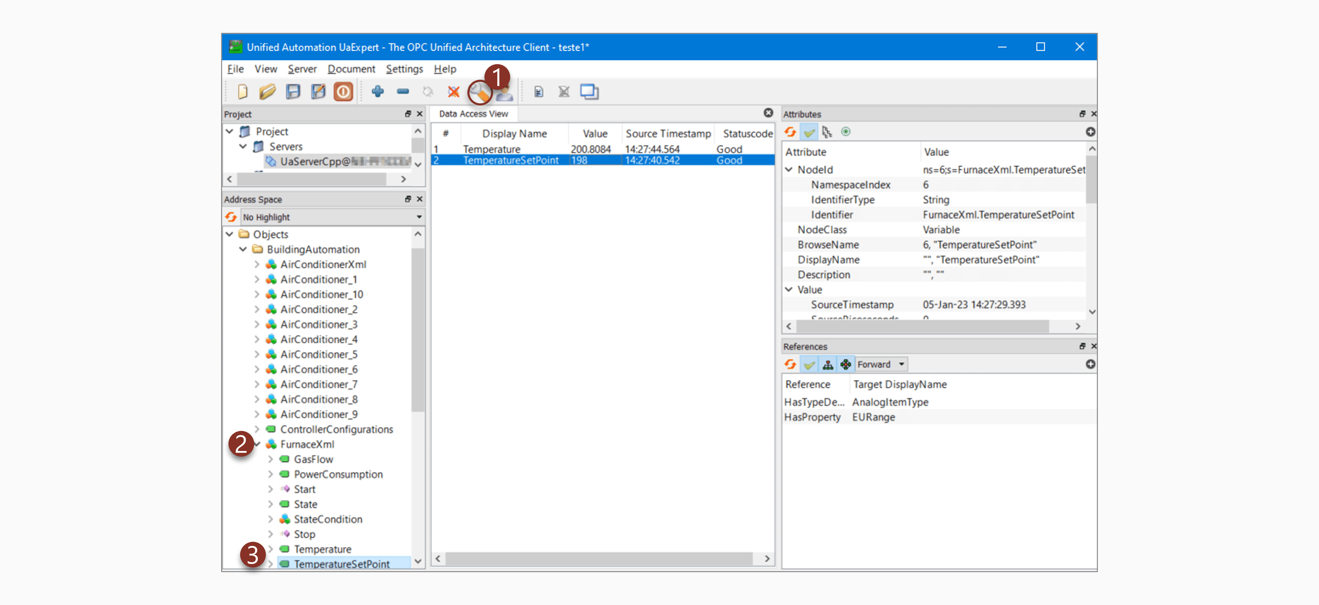 BuildingAutomation > FurnaceXml, and drag and drop Temperature and TemperatureSetPoint to the Data Access View