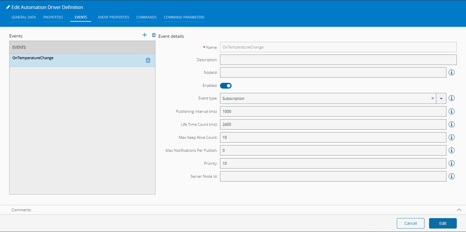 With this settings, when the OnTemperatureChange event is triggered, MES will receive the Temperature value, at the time it did happen. This tutorial does not focus on the equipment commands so skip the Commands panel and select Edit to complete your changes.
