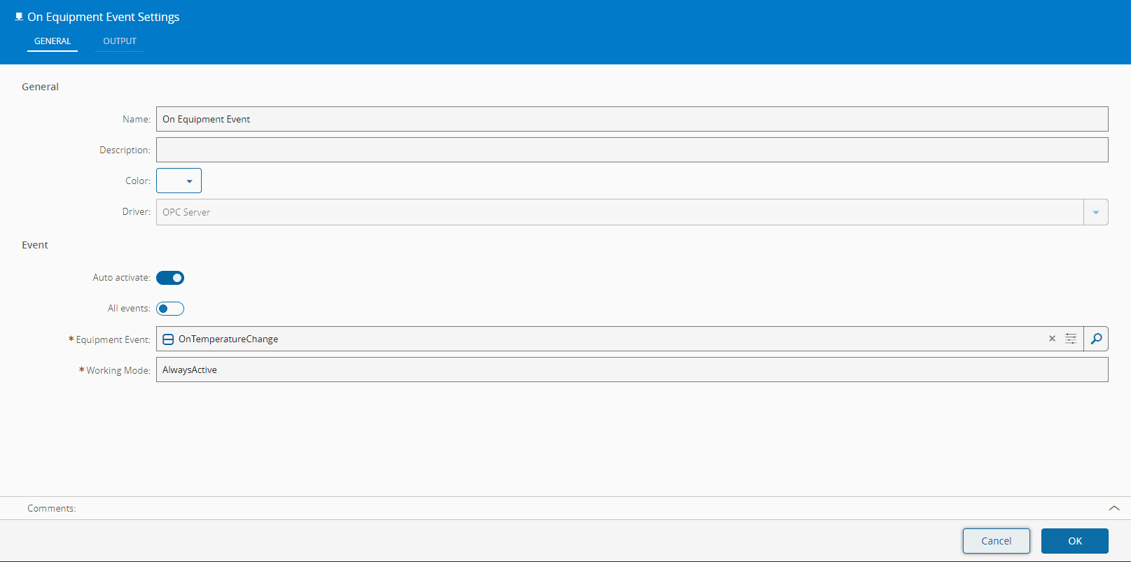 On Equipment Eventsettings and for the Equipment Event, select the Event OnTemperaturechange. -