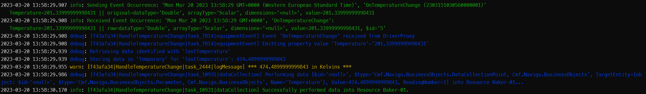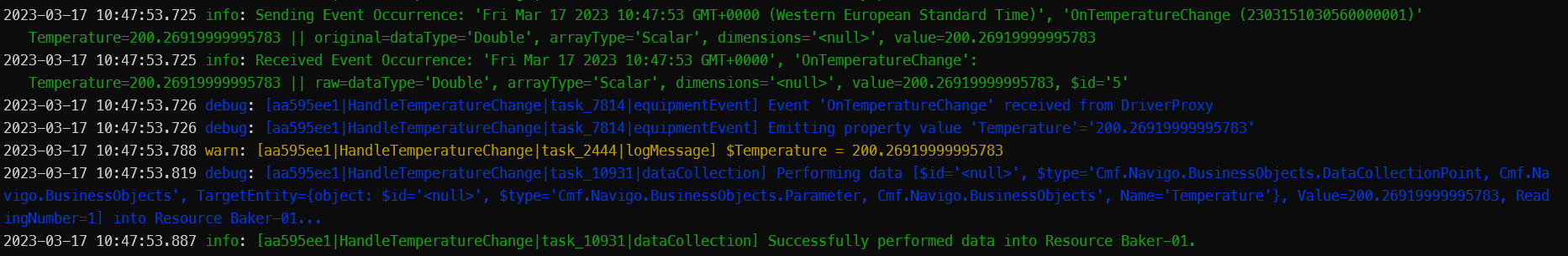 In the console output, notice you will now have two new log messages. One for temperature below 200ºC: