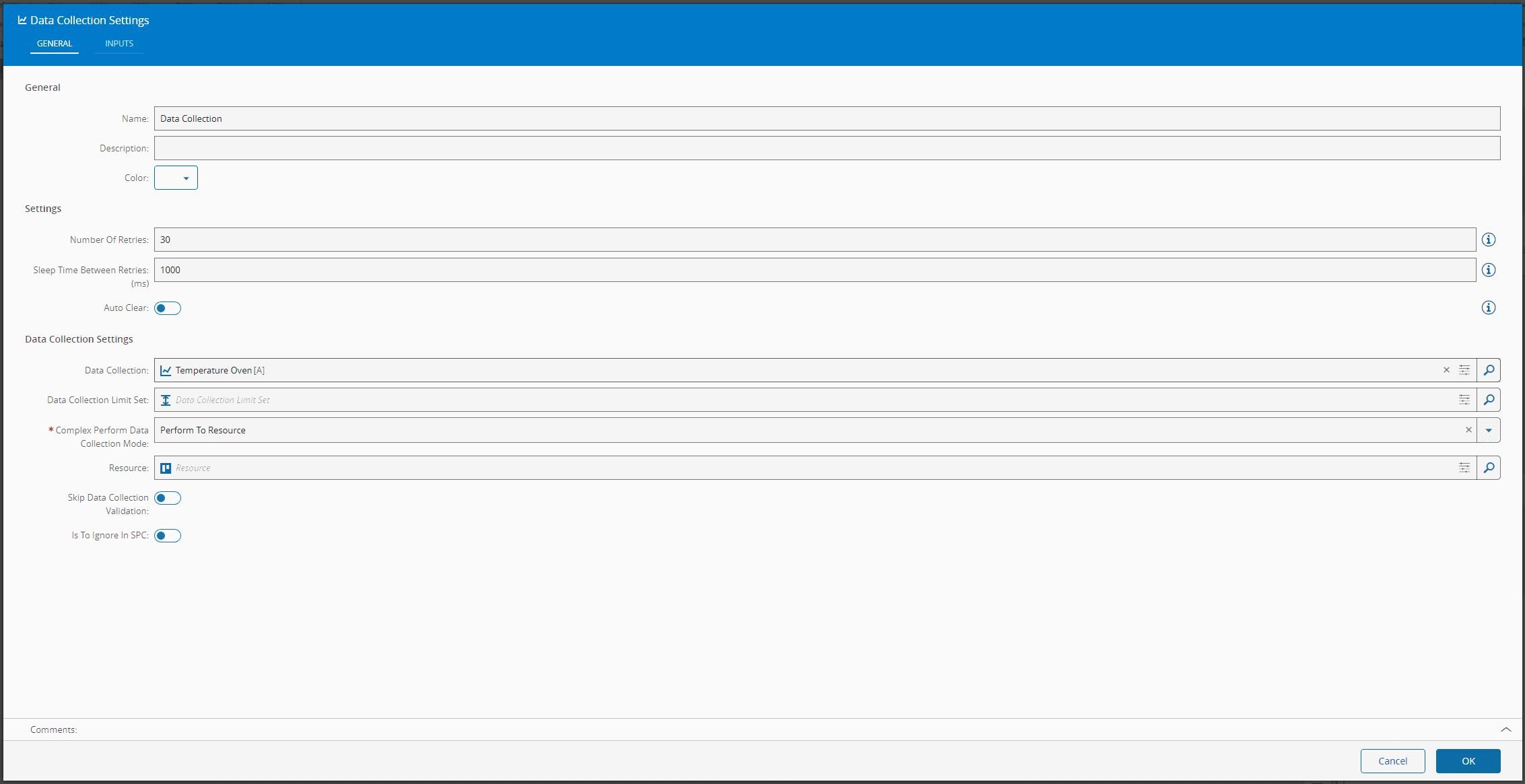 Business Data > Data Collectionand selectNew. Leave the defaults, give the name Temperature Oven and use the parameter Temperature we have created. -