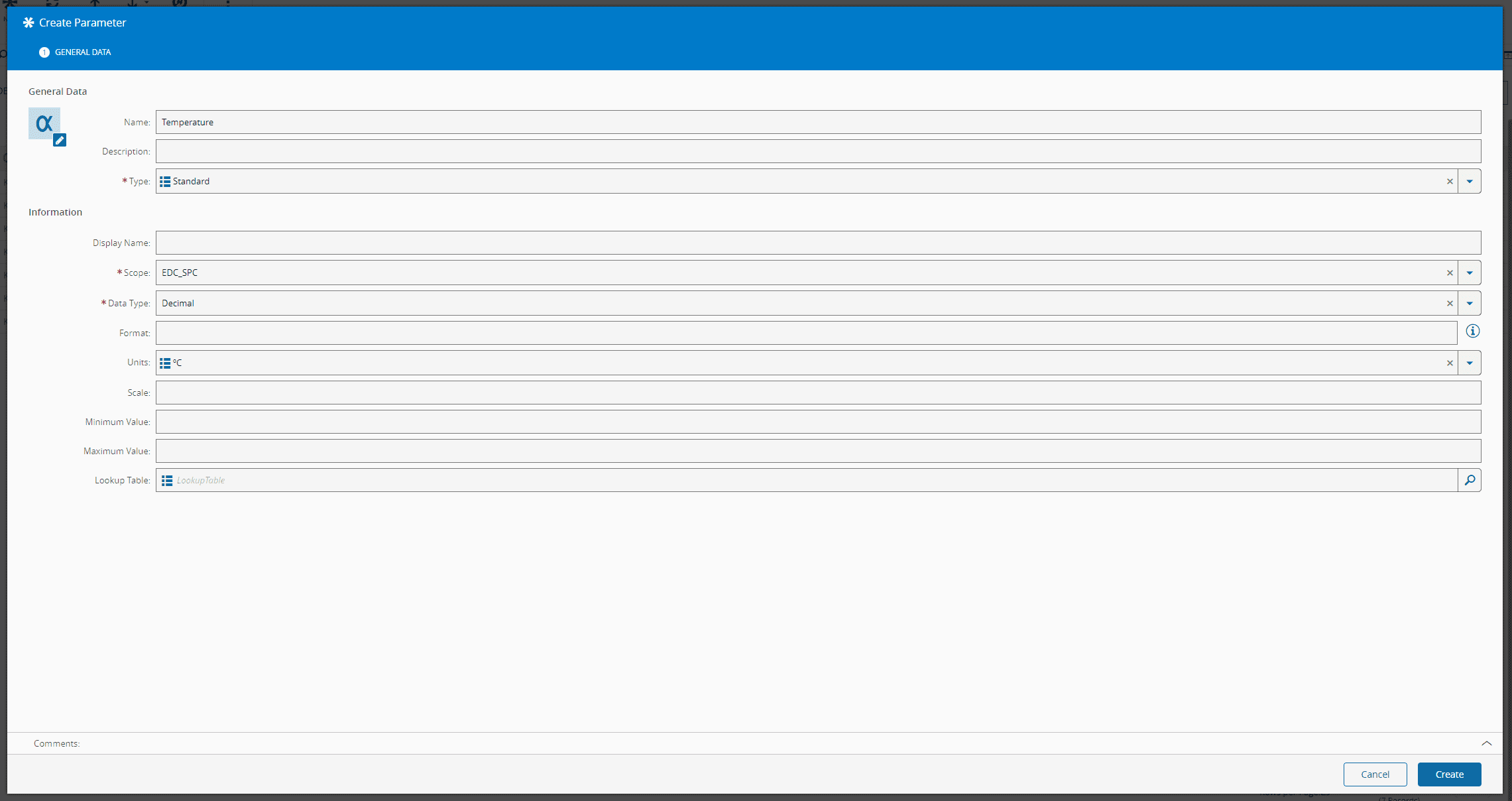 Business Data > Parameterand selectNew. Create a new parameter with name Temperature, data type Decimal and Units will be ºC and selectCreate. -