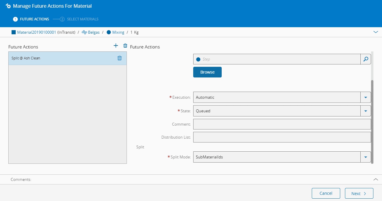 - 子物料ID。 此外,拆分和针对步骤进行拆分类型的预设锁定还需要对要拆分的物料类型和数量有进一步的规范。有关如何定义这些标准的说明,请参阅下文。