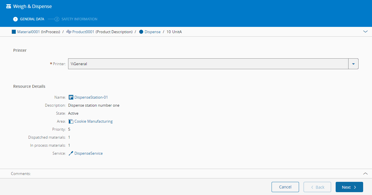 选择物料并打开“称量和分配”向导后,继续选择要使用的打印机(值取自PrinterTypePrintersContext智能表)。