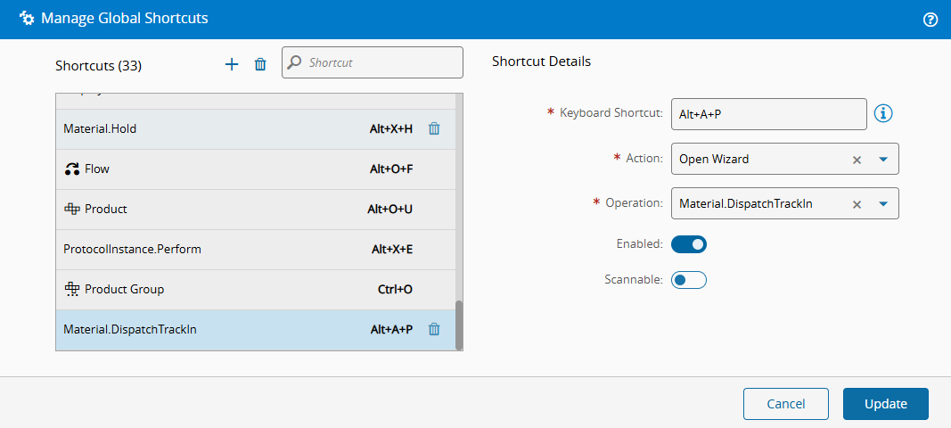 A scan shortcut can be used for any action where Scannable is enabled and a Scan String is defined.
