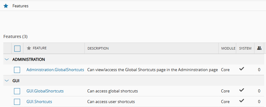 Shortcut permissions are controlled in the Features configuration area. You can review or assign the required access in Features.