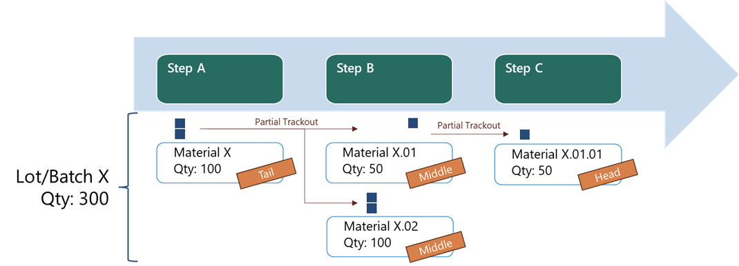 - The first split tracked out becomes Head; the remaining InProcess main material becomes Tail. Additional splits become Middle.