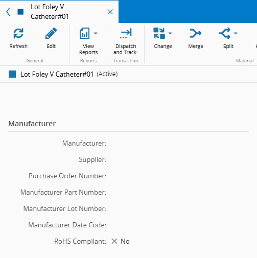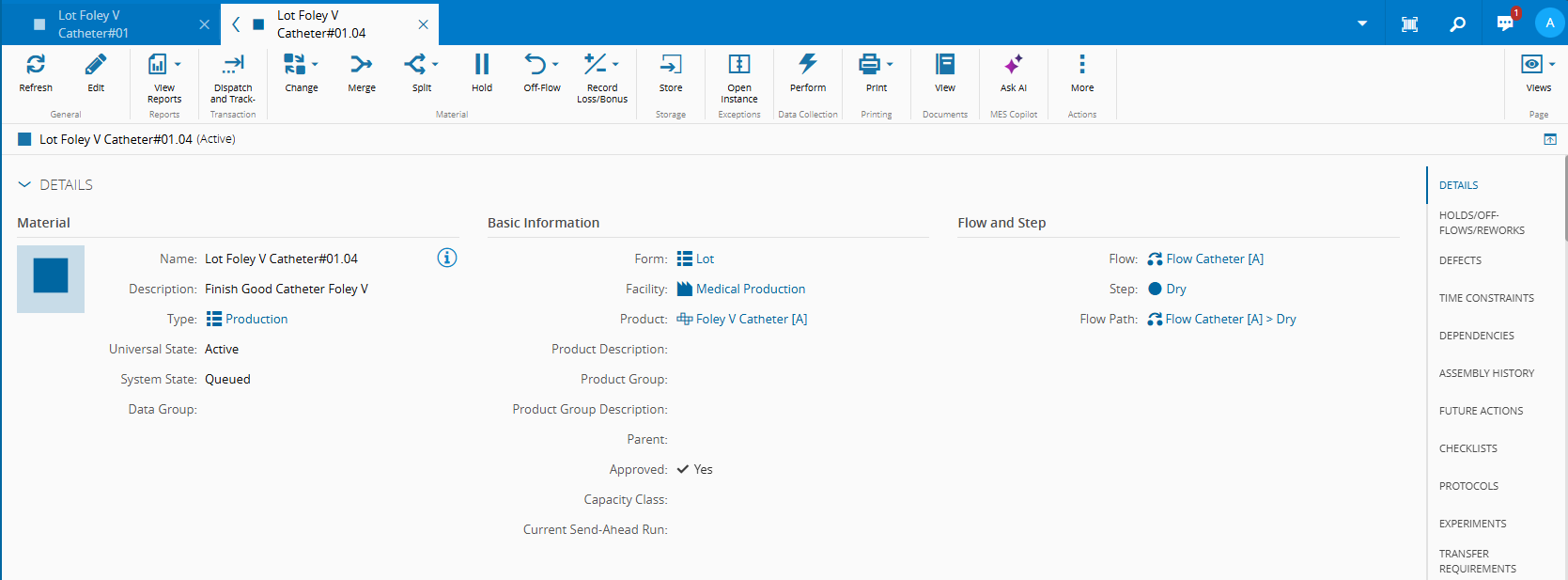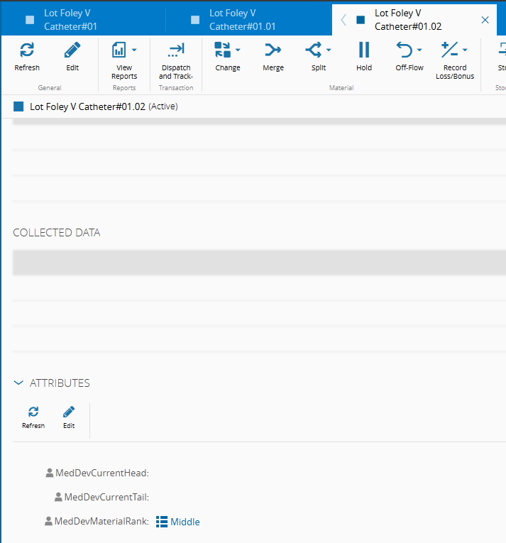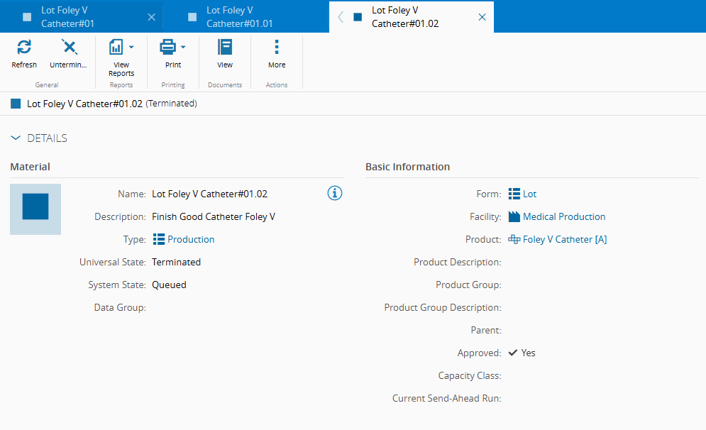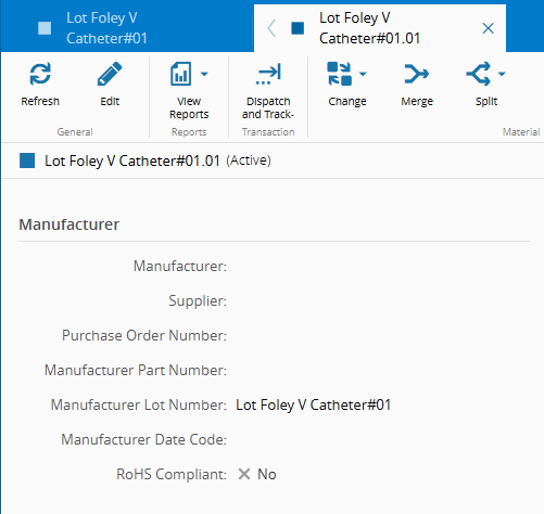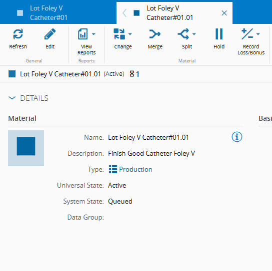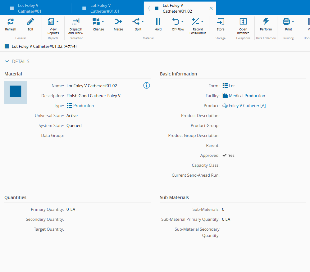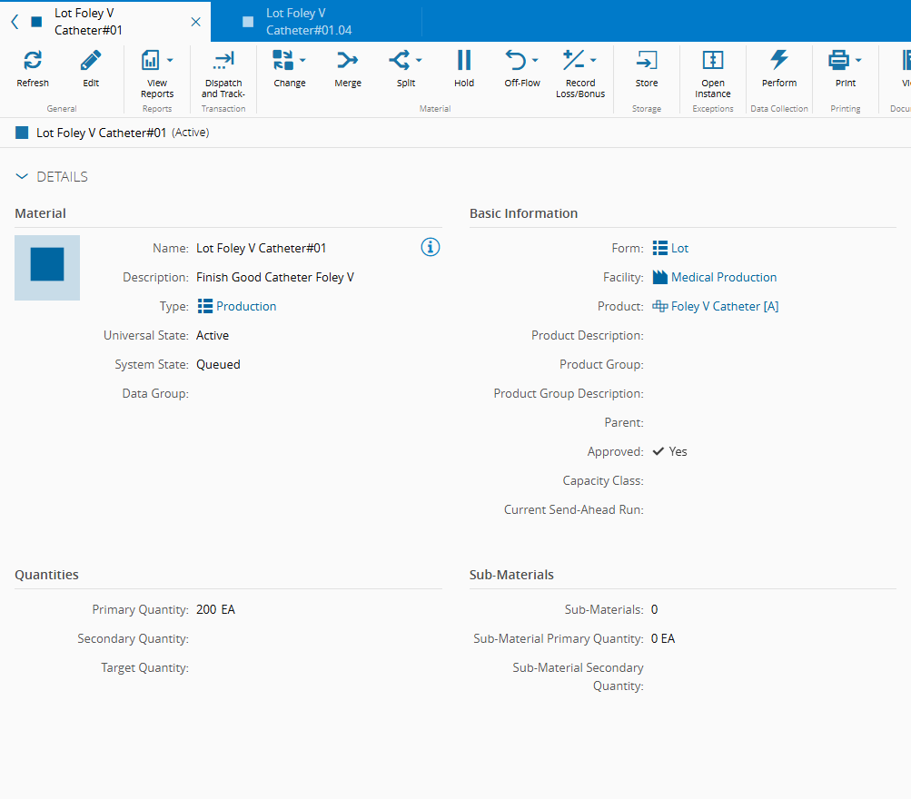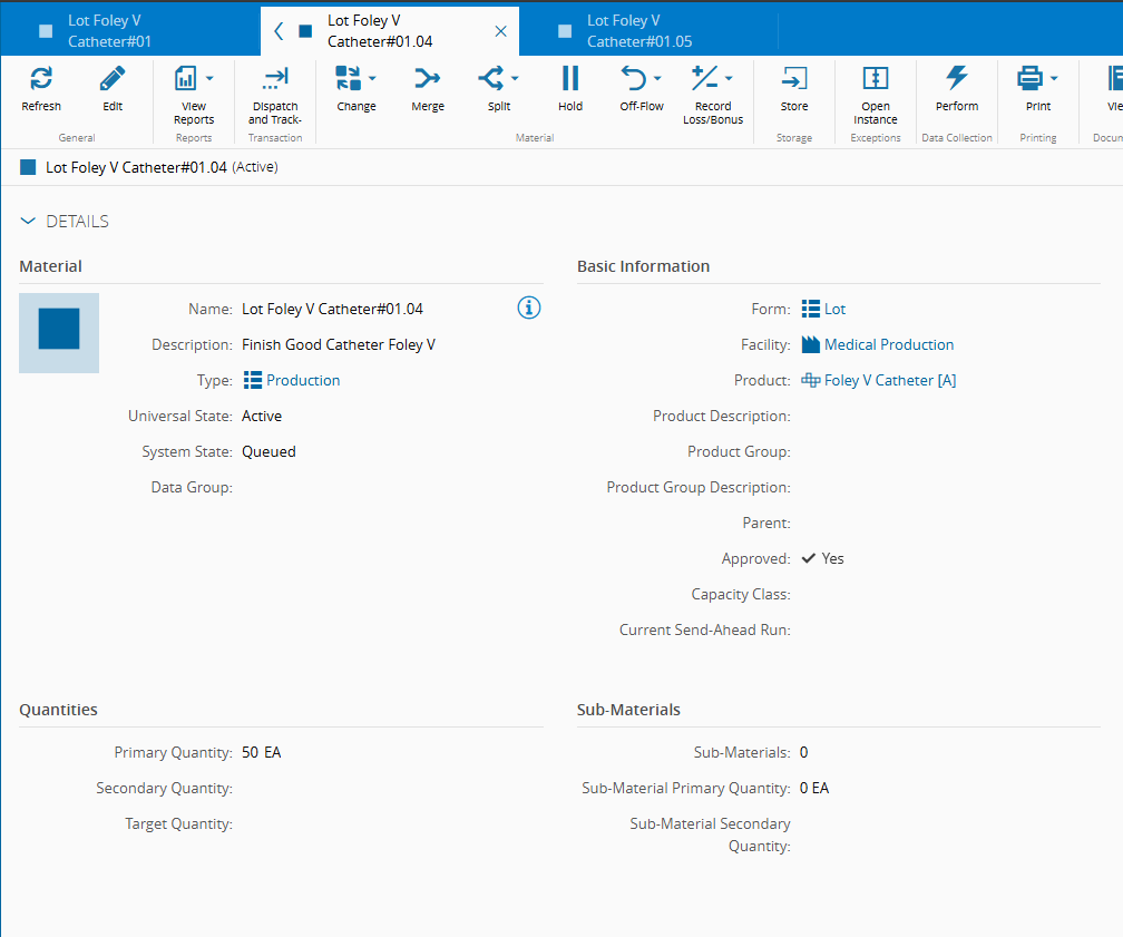 - Material - Lot Foley V Catheter#01 (this Material represents a lot with 500 units)