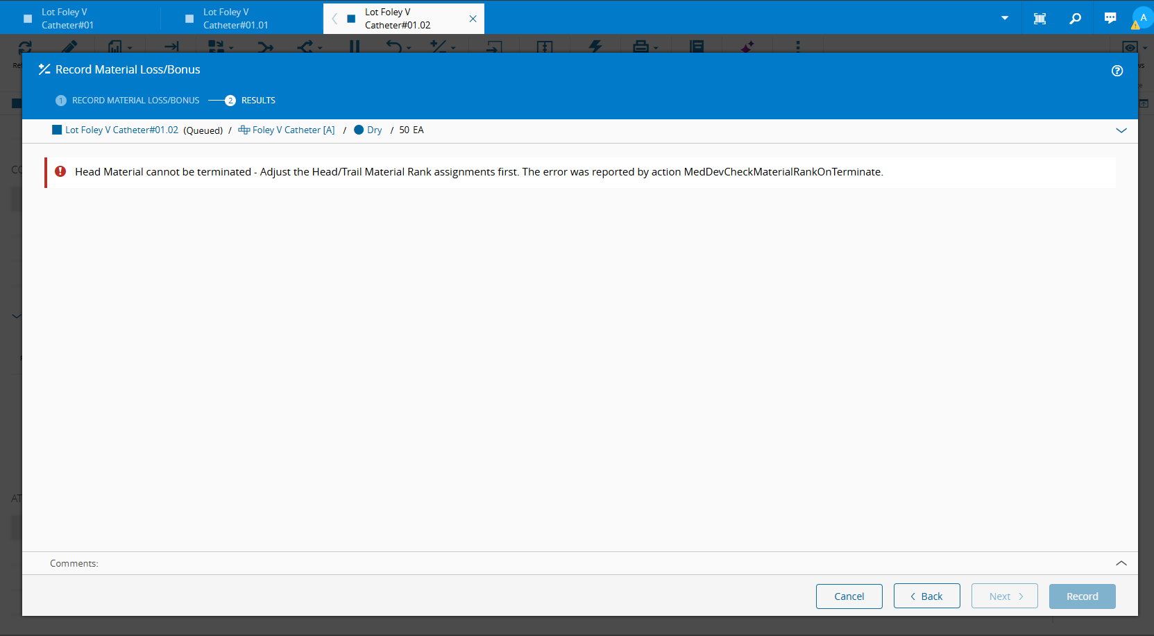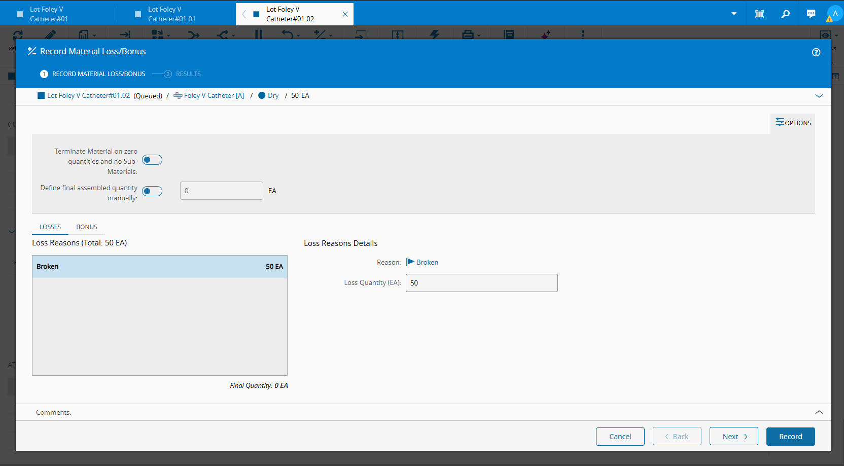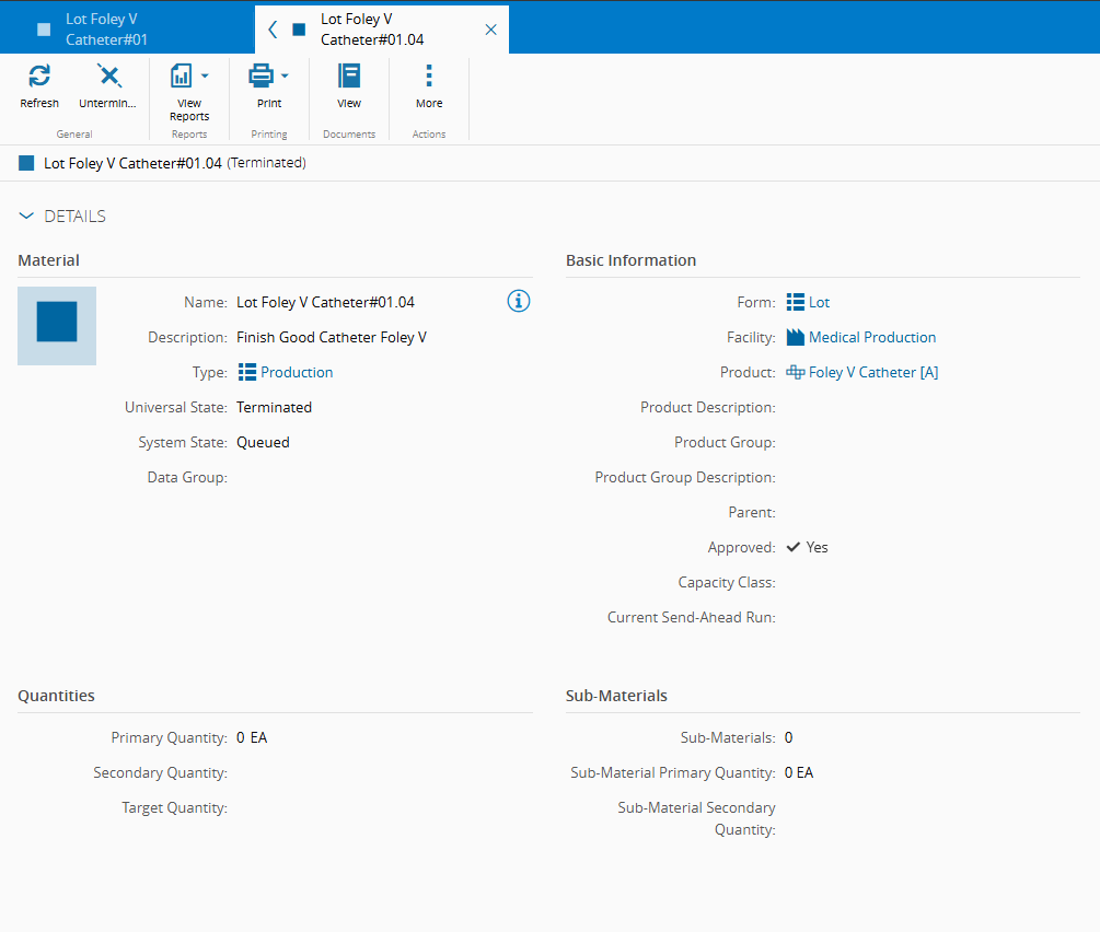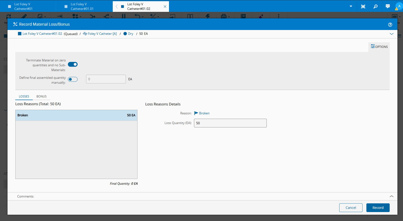 Lot Foley V Catheter#01.02but this time with optionTerminate Material on zero quantities and no Sub-Materialsset toFALSE -