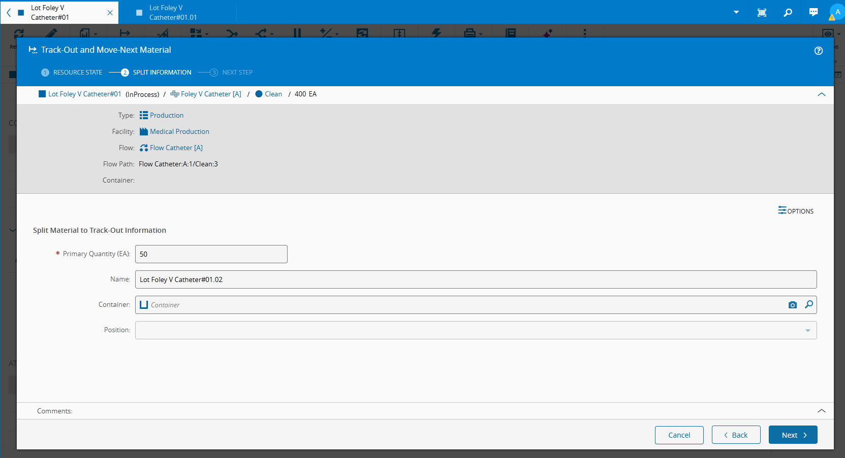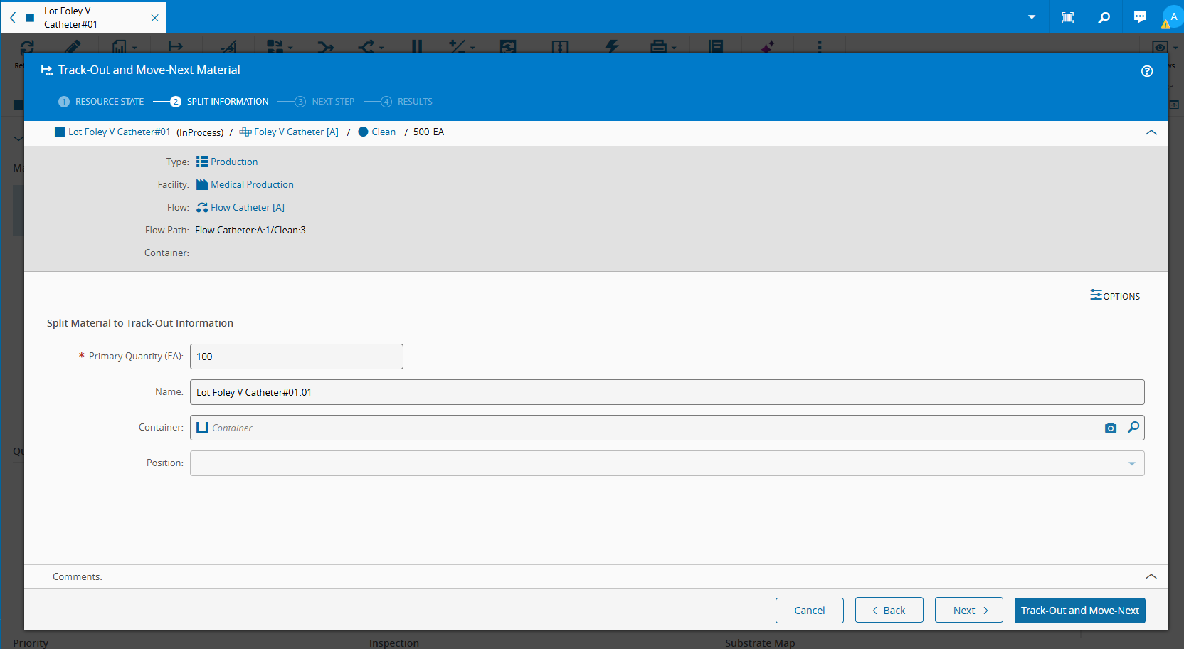 - The Partial Track-Out feature is used to Split the chunks of materials for the next Step.