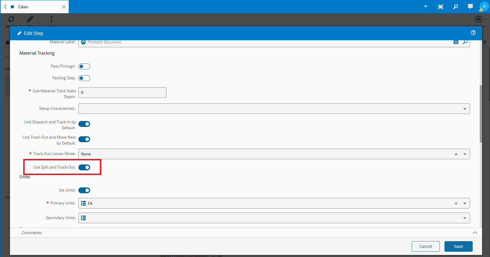 - Enable Partial Track-Out by setting the Use Split and Track-Out flag in step Clean
