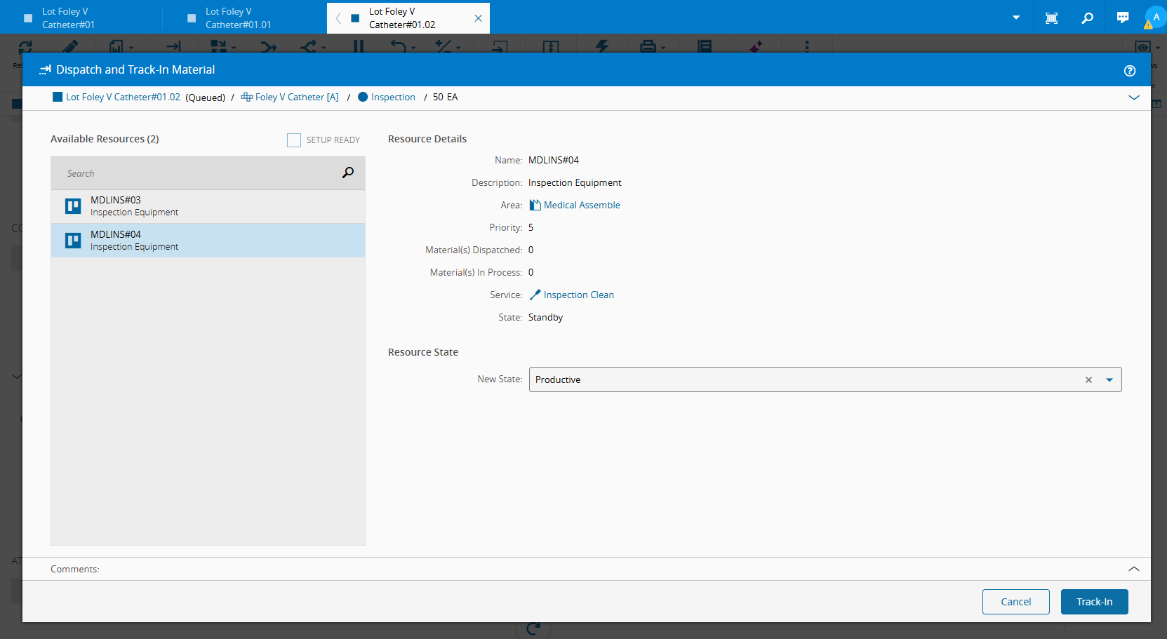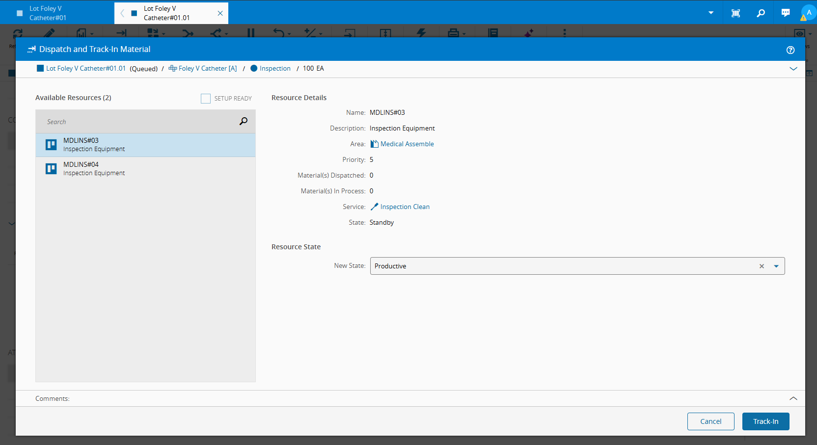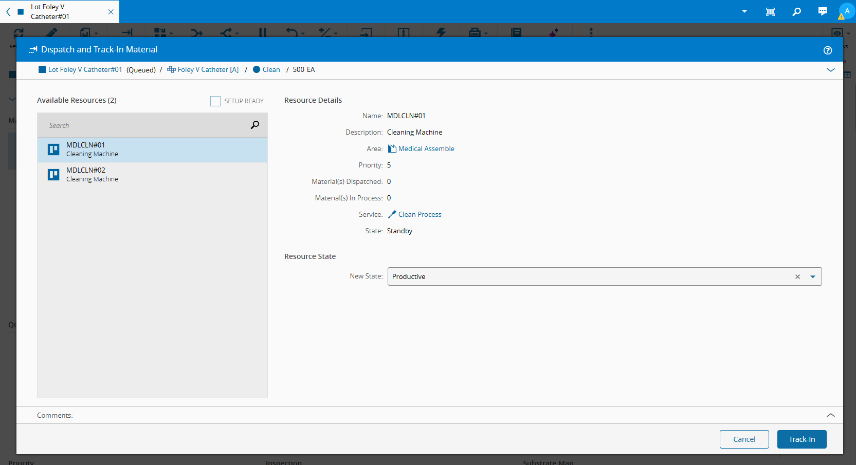 Clean, perform a Material Track In of the MaterialLot Foley V Catheter#01 -