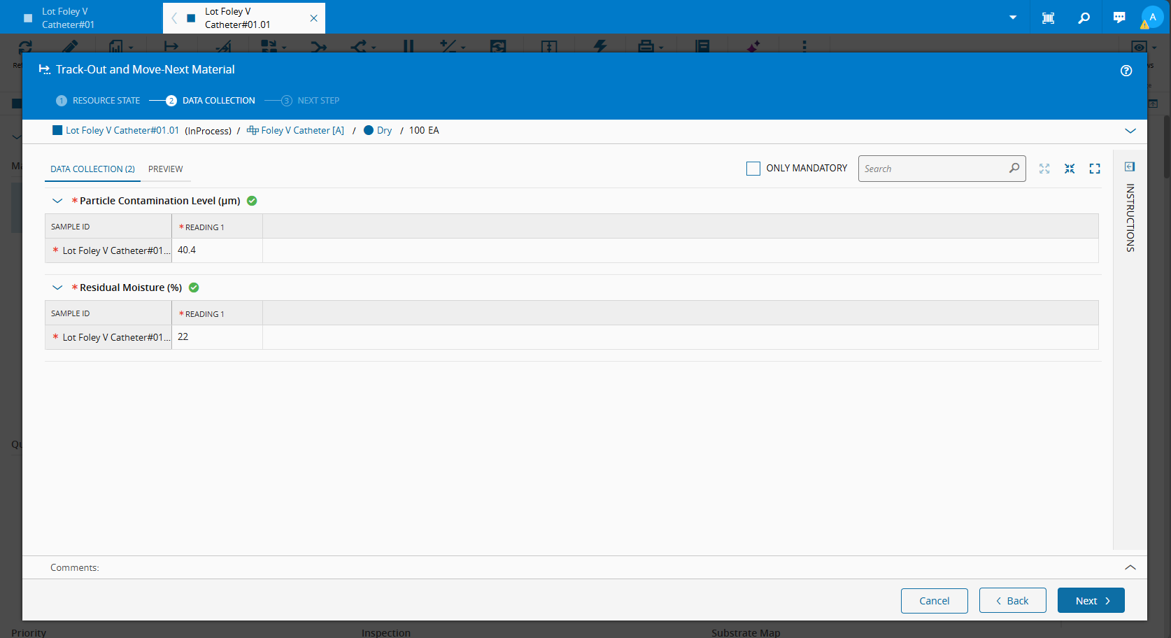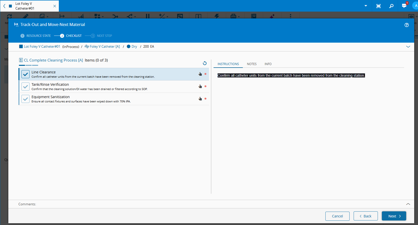 - Step execution activities like Checklists and Data Collections apply to the lot as a whole (not to each partial material individually).