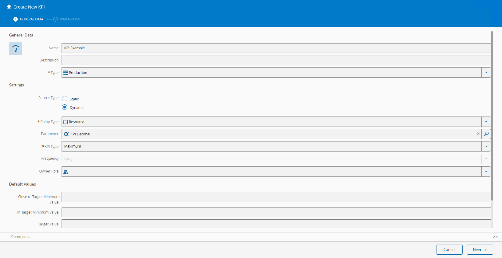 | Dimension | For dynamic KPIs, it defines the scope variation of the defined KPI, for example, Last 7 Days or Current Shift. |