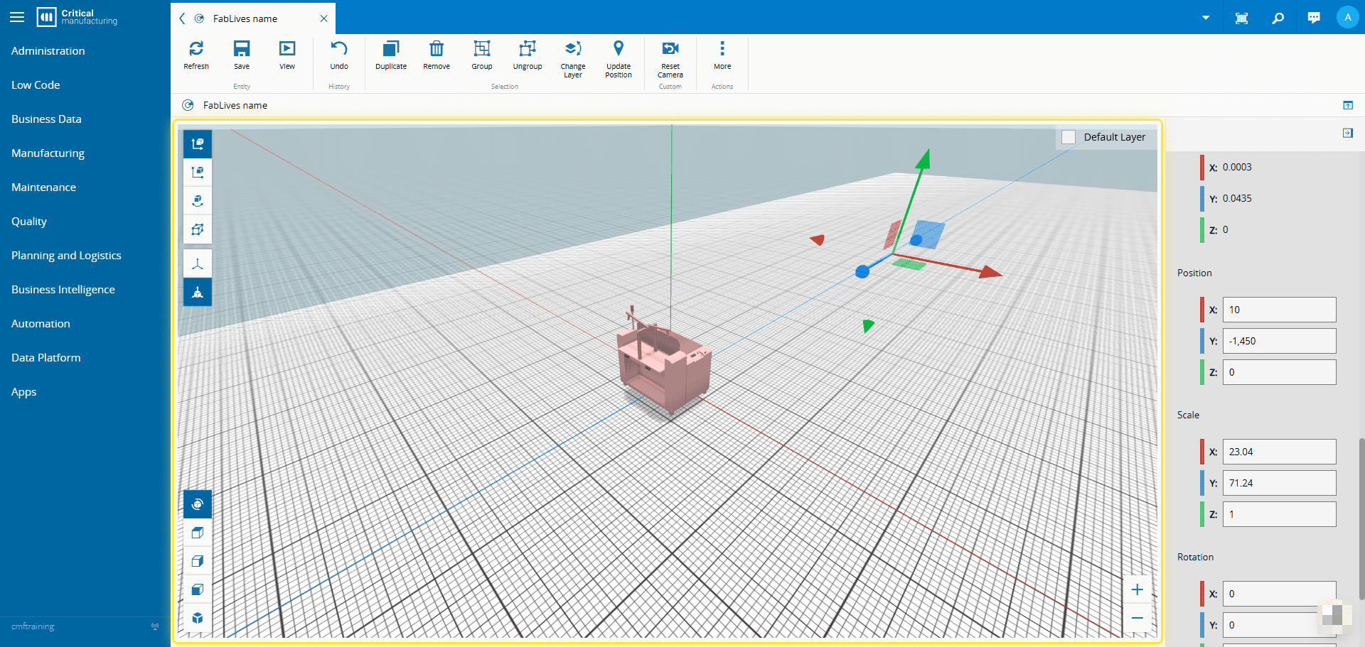 How to: Scale an object in FabLive# 1. Double Click the object to select it.# 2. Select the Scale option.# 3. Drag the handles (gizmos) around the object to resize it.# 4. Alternatively, edit its scale in the Selection Properties panel.#