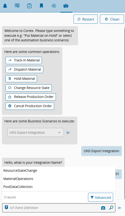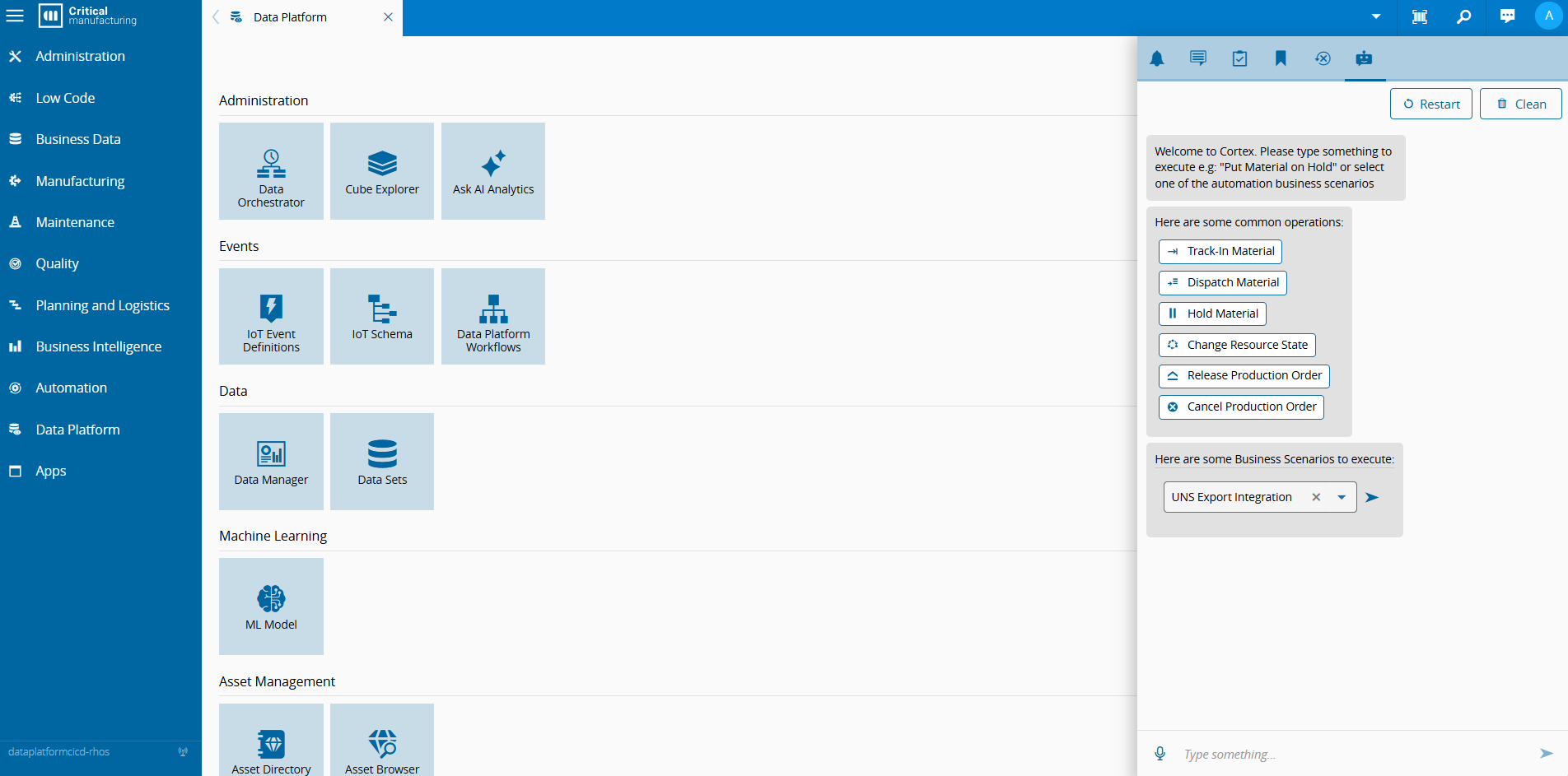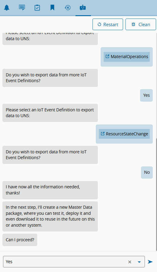 If the chatbot was already open in another scope, you may need to select Restart after switching to a Data Platform scope to ensure the UNS Export Integration business scenario is loaded correctly.