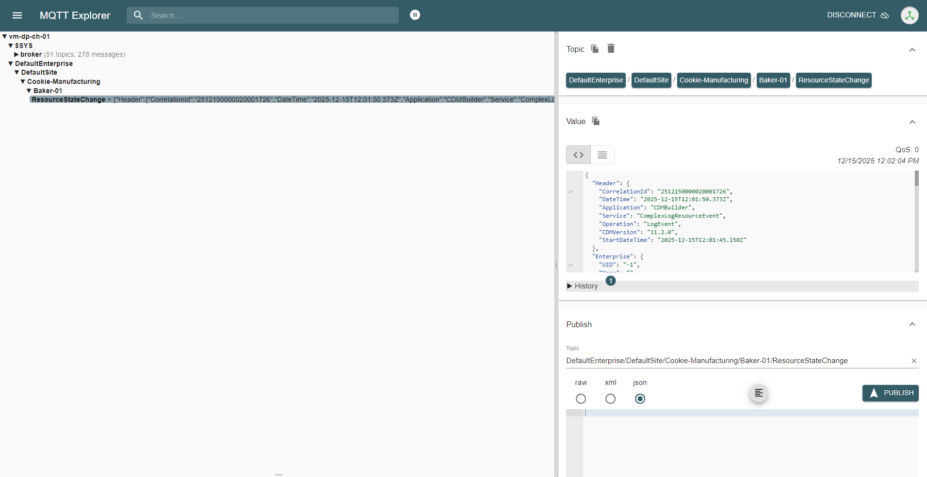 This confirms that CDM events are successfully published through the UNS into the MQTT broker, enabling scalable, real-time insights across the shop floor.