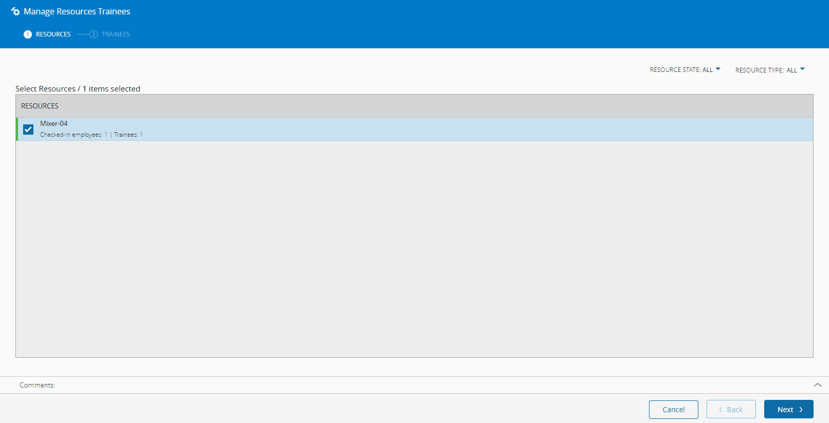 In this wizard, a Trainer can manage which of the trainees is logged into a specific Resource and perform check-in/check-out operations by selecting/deselecting the flag next to the Trainee.
