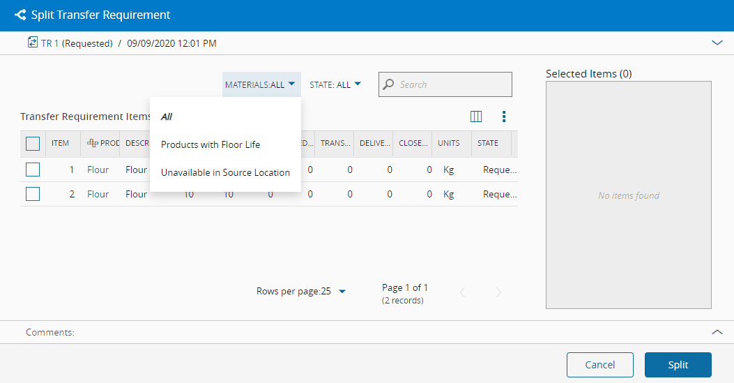 There are two tabs: Transfer Orders and Items (Transfer Orders Items). On the Transfer Orders tab is possible to select a row and perform the following operations: