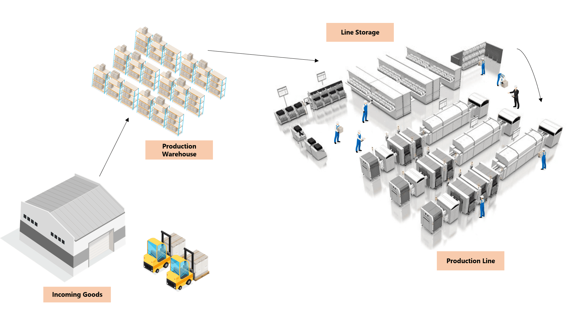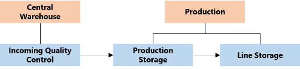 Taking the above-mentioned example, raw Materials are received and stored in the Incoming Quality Control Step, on the Central Warehouse Area. When required, Materials will be transported to the Production Storage Step and, then, will be transported to the Line Storage Step in order to be consumed, as displayed in the figure below.