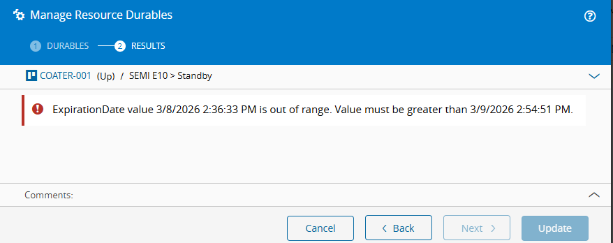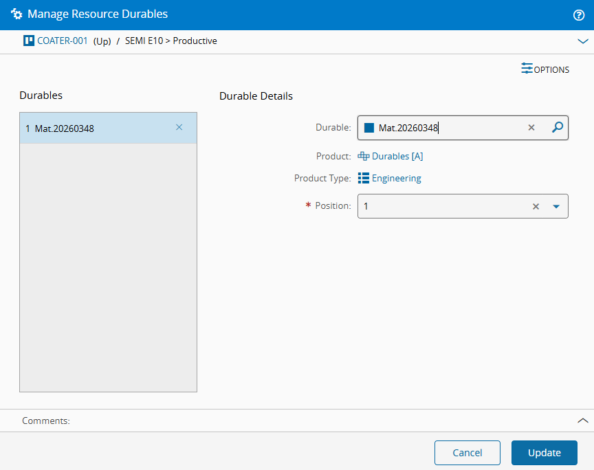 Next, use Manage Resource Durables to assign the durable to Coater-001.