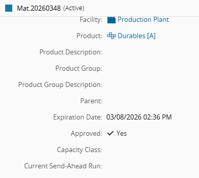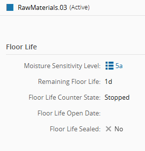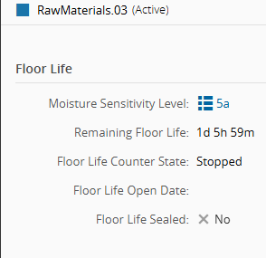 - Open the Material Details page and confirm that floor life is defined and the state is Stopped.