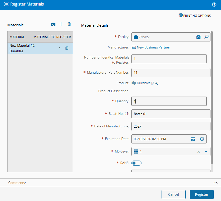 For this scenario, create the durable using Register Materials. The same behavior also applies if it is created directly in the material management page.