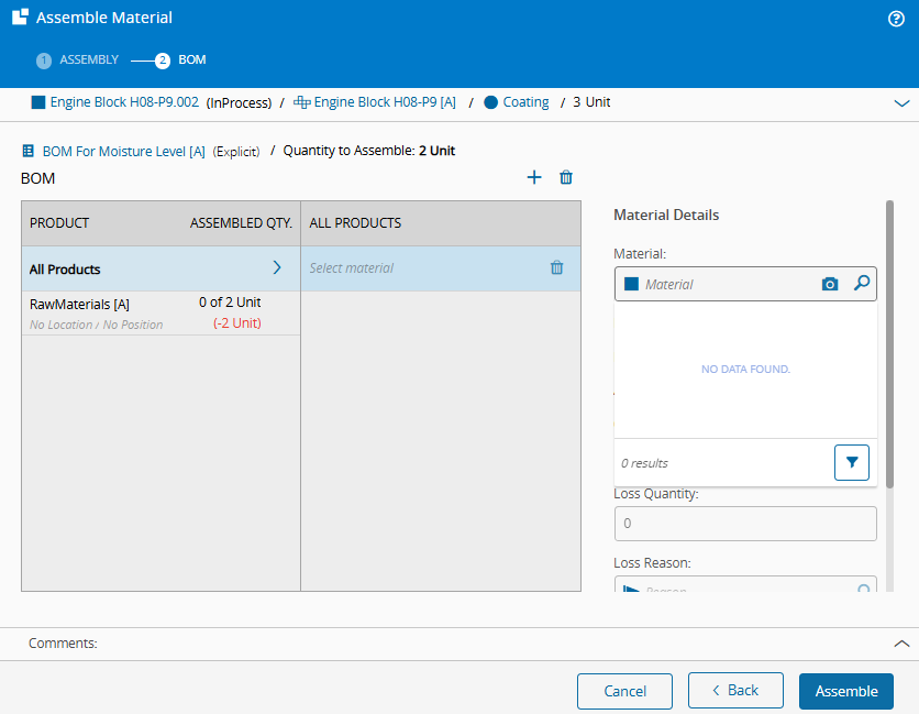 The scenario uses the Assemble Material operation.