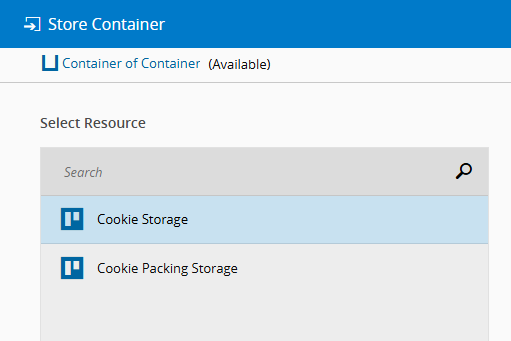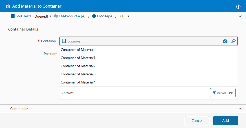 In this configuration, when you attempt to add a Material of type Production at the selected Step, only Containers of type Box appear in the selection list.