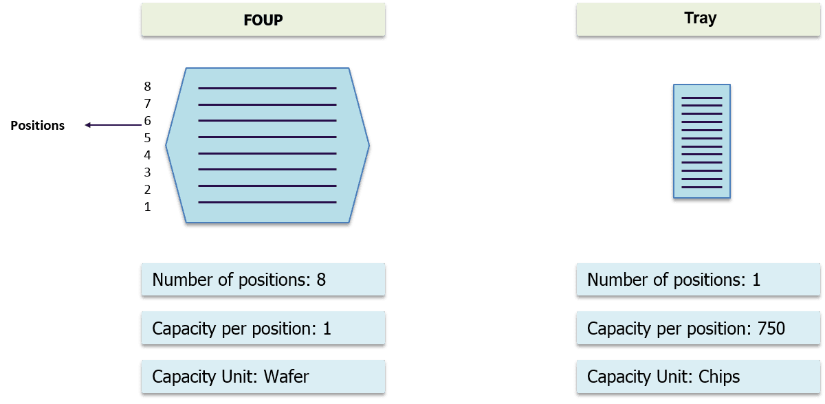 - FOUP (Front-Opening Universal Pod) — multiple positions with one unit per position (for example, a wafer carrier)