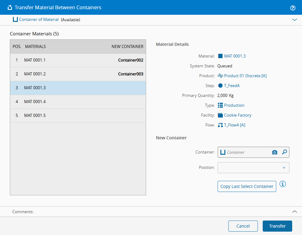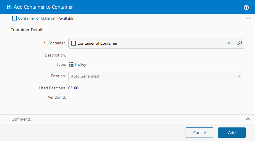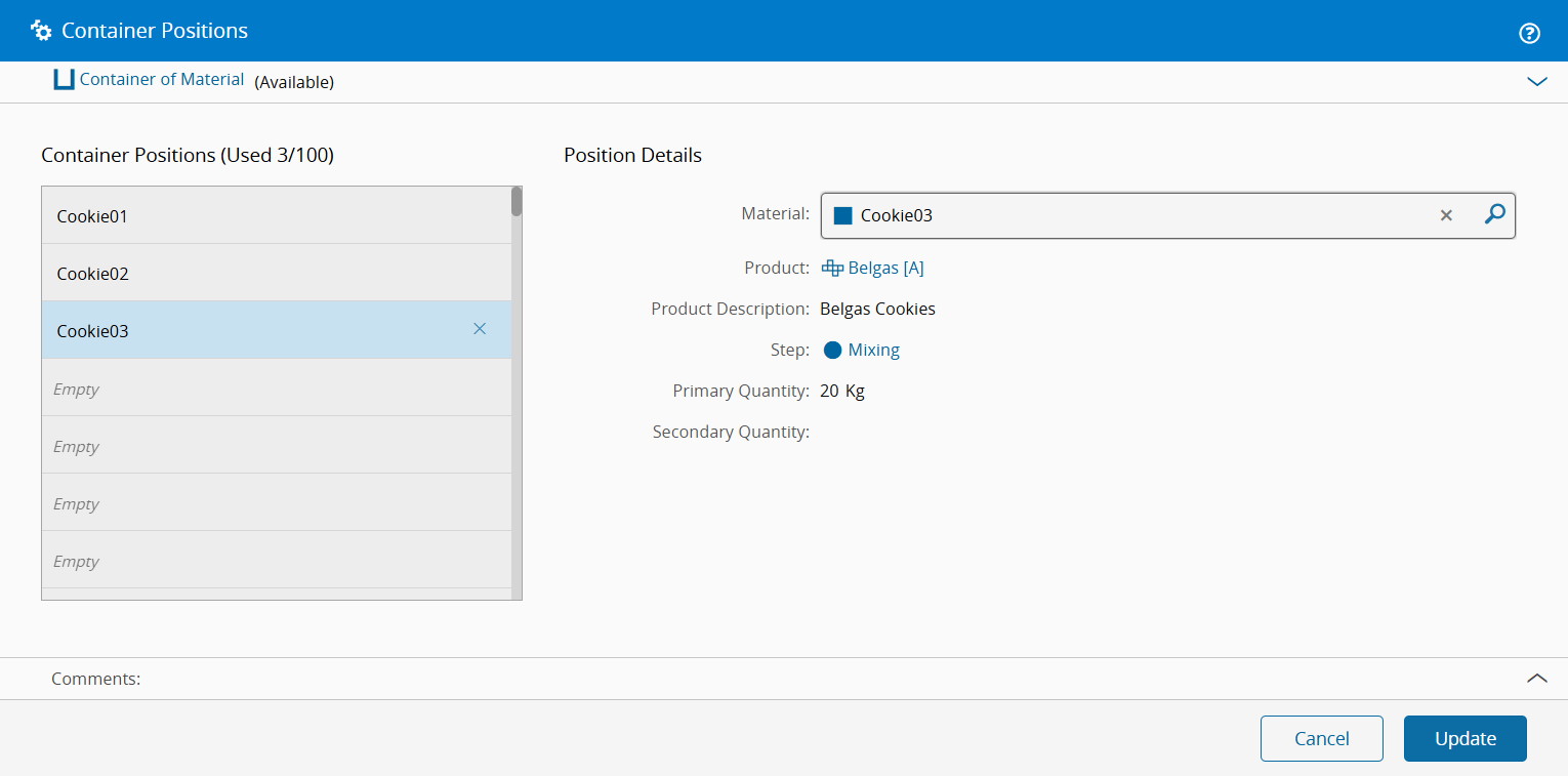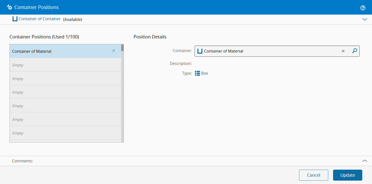 A Material Container has a capacity defined by positions available for a given Material unit. A Container can hold multiple Materials, but each position can contain only one Material.
