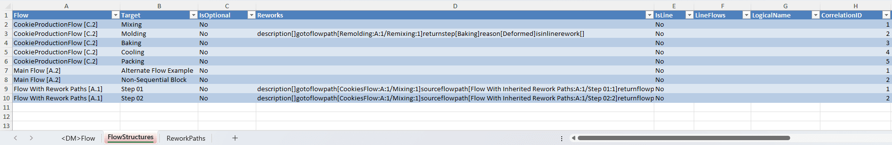 In version 11.0, the Flow Structure sheet was renamed to Flow Items, requiring you to change the name of this sheet in your Master Data template to be compatible with versions above 11.0. In addition, it's now possible to set Rework Path conditions, such as Expressions (column L), Rules (column M), Sampling Steps (column N), and Sampling Plans (column O). You can also define entry and exit Rules for Steps (columns J and K).