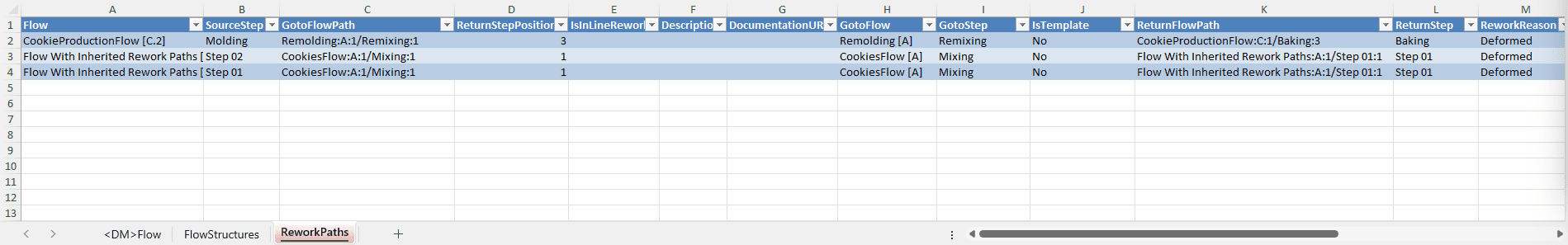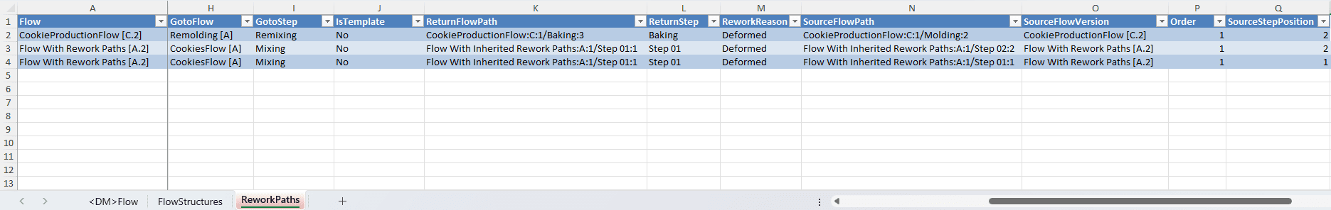 Beyond the basic information, you can specify additional settings in version 11.0, such as whether the Rework Path applies to Queued and Processed States (columns O and P), and set Rules for On Rework (column Q).