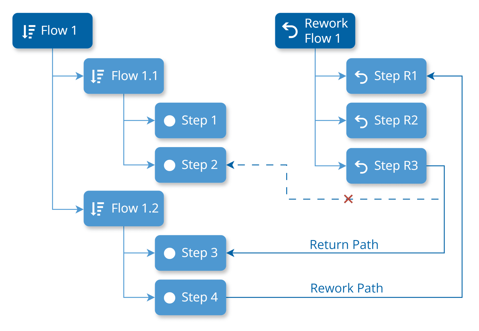 Before version 11.0, when configuring Rework Flows, the Return Path had to be a Step within that Flow. So, in the Before version 11.0 example shown below, if the Rework Path was configured in Step 4, the Return point would have to be Step 3. After version 11.0, Rework Paths can be defined at the Parent Flow level, allowing Return Paths to any Step within its structure. These Return Paths are anchored to the TopMost Flow where they are defined, rather than to a specific Flow Item. For instance, in the After version 11.0 diagram, the Return Path can be any Step (e.g., Step 1, Step 2, Step 3, or Step 4) within the TopMost Flow (Flow 1).