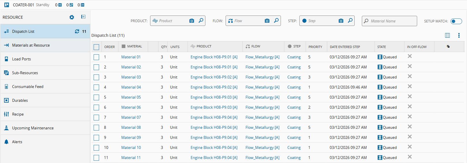 Coater-001Resource View. Before any Sort Rule Set is assigned, the materials are sorted by the Material column in alphabetical order. -