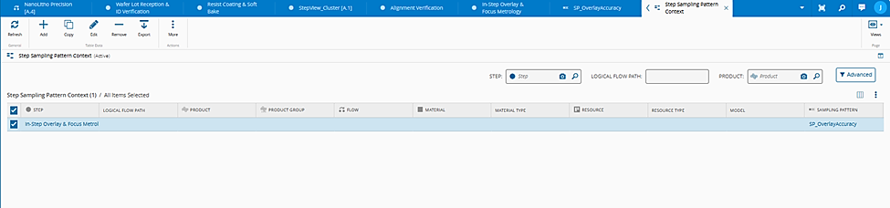 - In the smart table StepSamplingPatternContext, associate the Sampling Pattern with the step In-Step Overlay & Focus Metrology.
